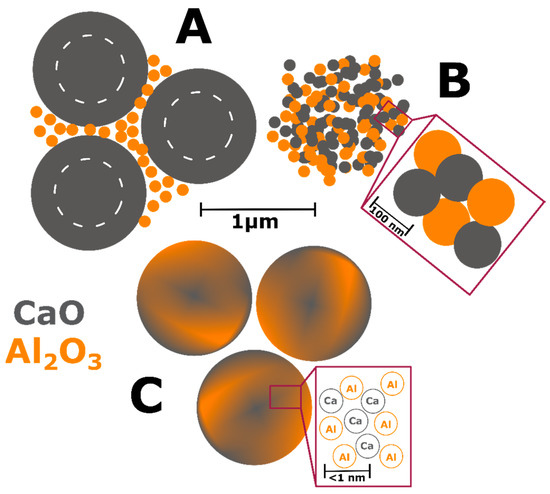 Schematic of reactant homogeneity with Ca species in gray and Al species in orange. High heterogenous solid-state reactants (A), low heterogeneity milled solid state reactants (B), and amorphous atomically homogeneity polymer assisted sol-gel reactants (C). The white circles in the high heterogenous reactant particles demonstrate the blind region of stoichiometry whose diffusion pathways are too long to effectively play a role in the phase formation reactions.