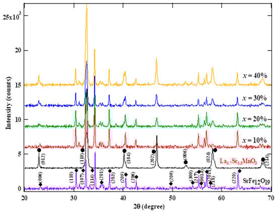 - Kim, D.H.; Kang, Y.M.; Ur, S.C.; You, J.H.; Yoo, S.I. Structure and magnetic properties of La0.7Sr0.3MnO3(1−x)–SrFe12O19(x) composites. J. Magn. Magn. Mater. 2018, 449, 567–570. [Google Scholar] [CrossRef]