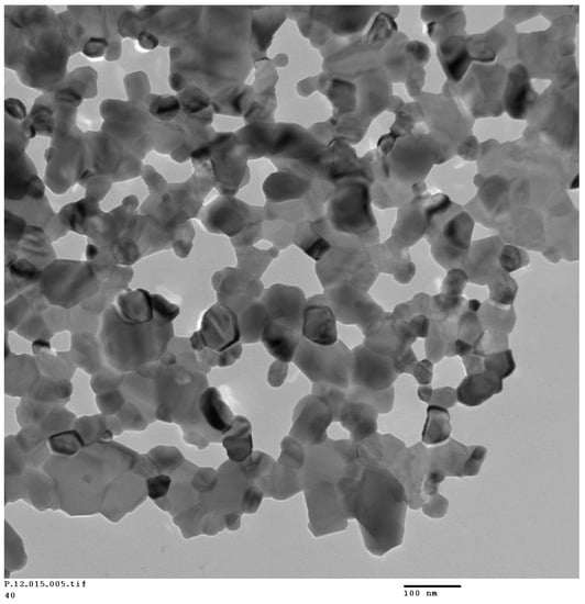 A representative TEM micrograph of the SFO-40 wt % LSMO composite is shown in Figure 2. This micrograph shows that the grain shapes of LSMO have a round shape, whereas SFO grains have unique hexagonal facets. It is believed that the darker particles are LSMO and the brighter hexagonal facet particles are of SFO, as LSMO contains heavier elements such as La and Sr than SFO. The grain size of LSMO is very different from that of SFO, and grains are in close contact where smaller LSMO particles have grown on the surface of the relatively large SFO plates in the composite. This observation is in confirmation to the earlier reports on LSMO-SFO prepared via solid-state reaction [31,32]. This proximity of LSMO and SFO particles could facilitate effective exchange-coupling between hard and soft phases, as discussed below.