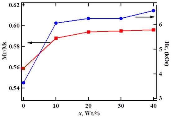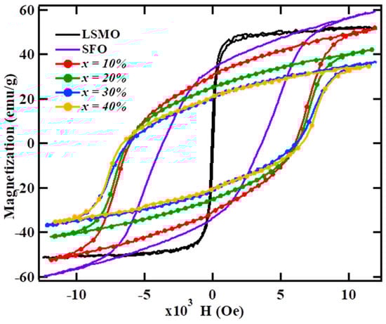 From Figure 4, it is seen that coercivity (Hc) increases with the content of the soft LSMO phase in the composite. An overall 80% increase in Hc value (6569 Oe) of x = 40 wt % composite as compared to that of Hc value (3633 Oe) of SFO is observed. In earlier reported studies of hard-soft exchange-coupled composites, the coercivity was observed to be lower than the hard-phase compound. This means that, by increasing the reverse field, the soft phase domain walls move toward the interface between the soft and hard phases and exceed into the hard phase and cause magnetization reverse to that phase. Therefore, the coercivity of the samples decreases in comparison to the hard phase region [40,41]. Considering the small size and proximity of hard-soft phases (Figure 2), it is possible that the volume fraction of the hard phase is enough to exert exchange force on magnetization in a soft grain of SFO, thus preventing the magnetization in soft grains from reversal with the applied field reversal. Furthermore, with the increase in the soft phase content, the coupling between magnetization inside different hard grains is not very strong, because direct coupling is prevented by the presence of the soft grain and because the indirect coupling through the soft grain is prevented by a small value of soft–soft exchange constant [42]. Therefore, the coercivity increases with the increased volume of the soft phase. With this observation, the absence of a pinning interfacial layer, a layer that is detrimental to the coercivity enhancement, can be hypothesized. Considering the auto-combustion synthesis process adapted here, where compound formation occurs with the rapid diffusion of ions, it can be safely assumed that the as-synthesized composites are devoid of interfacial pinning layers.
