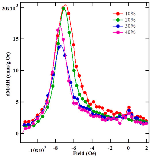 The switching field distribution, dM/dH vs. H curve is a characteristic feature of interphase exchange-coupling, as shown in Figure 5. The distribution of the switching field shows a narrow dM/dH peak and corresponds to a narrow crystallite size distribution [43,44]. Generally, two distinct maxima are expected for an uncoupled hard and soft phase mixture if the coupling between the hard and soft phases is weak. The width of these dM/dH peaks can be interpreted as an estimation of the efficiency of hard/soft inter-phase exchange-coupling: the narrower the peak, the better the exchange-coupling between the soft and hard phase. Furthermore, the large peaks and the long tails testify about the percentage of crystallites, which are not well coupled by exchange to the hard phase. It is evident from Figure 5 that the width of dM/dH peaks decreases with an increase in LSMO content in the composite, which indicates increasingly effective exchange-coupling between the hard-soft phases of the composite.