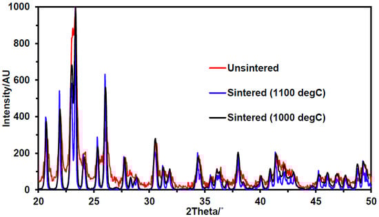Samples of powdered aluminum tungstate were sintered at 1100 °C and 1000 °C. XRD of ground samples of the green bodies revealed that both samples became more crystalline after sintering, and neither showed evidence of decomposition, which is consistent with literature reports []. Upon sintering, the particles regained the crystallinity lost during ball milling (see Figure 2). While the aluminum tungstate was clearly more crystalline above 1100 °C, the internal structure created was destroyed by sintering at the higher temperature (the sample was slumped and no longer cylindrical). After sintering at 1000 °C, the material was both crystalline and robust.