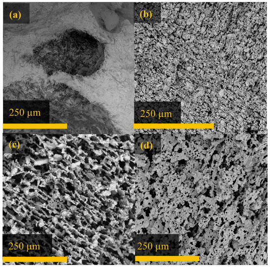 After sintering at 1000 °C, SEM images confirmed that the internal lamellar structure was retained. The average Al2W3O12 grain size increased after sintering. SEM images revealed that the morphology of the aluminum tungstate particles in the scaffolds was distinctly different from that of the particles added to the slurry, being nodular rather than grainy and foliated (see Figure 3). The particles after sintering were somewhat larger, 4 μm vs. 0.6 μm on average. This change is likely due to the relatively high sintering temperature required to restore crystallinity; the rate of aluminum tungstate particle growth has been shown to increase significantly above 830 °C [], and densification of bulk Al2W3O12 begins to occur rapidly during sintering at ca. 830 °C [,].
