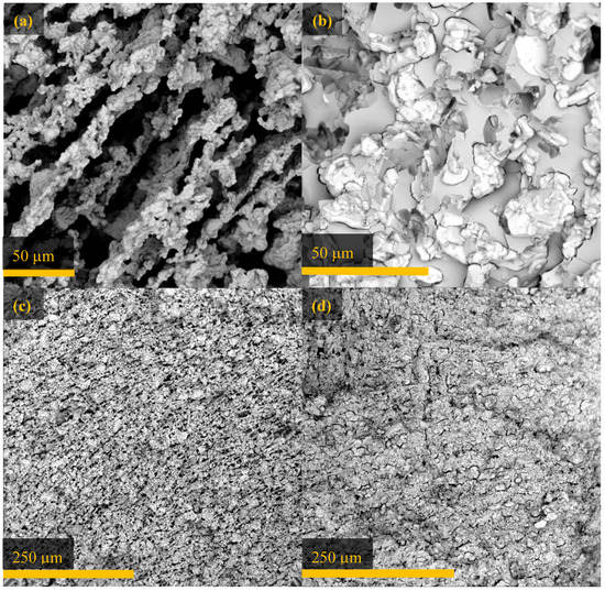 The size of the particles/agglomerates in the slurry has a strong influence on the growth of ice during freeze-casting and, consequently, on the morphology of the final product [,]. Larger agglomerates are detrimental to ice growth, as it is more difficult for the growing ice crystals to push such large particles aside [,]. Much smaller agglomerates produce inhomogeneous structures, as their higher surface area to volume ratios lead to increased ice nucleation []. A mixture of large and small particles (e.g., 400 nm and 40 nm) can lead to good packing during freeze-casting [,].
