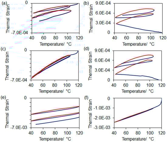 Dilatometric heating and cooling curves of Al2W3O12/PMMA composites, excluding the first heating curve, measured parallel and perpendicular to the direction of ice growth. The red lines indicate the heating curves while the blue lines indicate the cooling curves. (a) 98 vol % Al2W3O12, parallel to ice growth; (b) 98 vol % Al2W3O12, perpendicular to ice growth; (c) 64 vol % Al2W3O12, parallel to ice growth; (d) 64 vol % Al2W3O12, perpendicular to ice growth; (e) 34 vol % Al2W3O12, parallel to ice growth; (f) 34 vol % Al2W3O12, perpendicular to ice growth.