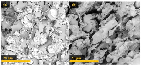 The dilatometric thermograms of the composites, measured both parallel and perpendicular to the direction of ice growth, are shown in Figure 6. The first heating curve during each run is excluded as most displayed large negative thermal strains due to desorption of water from the composites and/or consolidation of the PMMA (see Figure 7). (TGA results shown in Figure S7 in Supplementary Material indicated that the composites contained 1 mass % of residual water, likely originating from the polymerization or absorbed from the air.) The composites showed some negative hysteresis when heated above 110 °C, which can be attributed to densification of the surface PMMA layer. SEM images of the composites before and after thermal cycling in the dilatometer show that the PMMA condensed (see Figure 7), resulting in increased porosity. As Figure 7 shows, there exists significant porosity at the interfaces between the PMMA and the Al2W3O12 before cycling. The CTEs of the composites measured parallel and perpendicular to the direction of ice growth are presented in Table 2. These values can be compared to the dilatometric CTE of bulk Al2W3O12 (1.5–2.0 × 10−6 K−1) [] as the empty scaffolds (which were too fragile to prepare for dilatometric analysis) would be expected to have CTEs within this range. It is important to note that the thermal expansion behavior of the composites remained consistent (and consistently larger than that of bulk Al2W3O12) after the first heating cycle, indicating that the Al2W3O12 remains in effective mechanical contact with the PMMA. That is, during the heating and cooling cycles, the thermal expansions of the two components are significantly counteracted by each other; therefore, the polymer–ceramic interfaces are sufficiently robust to allow transfer of mechanical forces due to thermal expansion. The consistency of the CTEs upon repeated cycling shows that the interfaces are not significantly damaged by the thermal stresses put upon them.