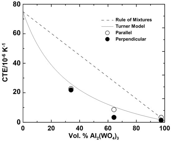 The thermal expansions of the composites were measured using a push-rod dilatometer (NETZSCH, Upper Franconia, Germany, model DIL 402 C). Each sample was cycled three times; each cycle consisted of heating at a rate of 10 K min−1 and cooling at a rate of 5 K min−1. The linear coefficient of thermal expansion was determined from the slopes of the heating and cooling curves from the resulting plots of thermal strain as a function of temperature. Dilatometric cooling curves are, in general, less affected by the formation and healing of microcracks [], but the results here are similar for heating and cooling (see below) so both were included in the averages.