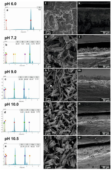 The morphological and elemental analysis of HAp coatings. (a–e) EDS spectra and (f–j) top view SEM images showing the morphological evolution of calcium phosphate crystals synthesized on Ti/TiO2 through hydrothermal method for different ammonium hydroxide concentrations. Panels (k–o) show the cross-sectional images of HAp coatings synthesized at different pH.