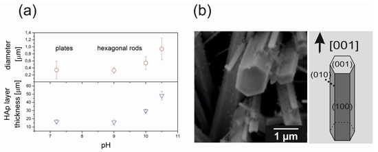 Strong inhibition of crystal growth shown in the SEM image for low pH (pH < 7) could be due to the fact that the coating precipitation under hydrothermal conditions is a complex phenomenon and pH of the solution also affects the chemical nature of the Ti/TiO2 substrate itself. We intentionally created the TiO2 layer on Ti since the surface of titanium oxide in aqueous medium exhibits surface charge strongly depending on the pH of solution. Surface charge can promote crystal nucleation, and the electrostatic attraction may be the driving force for the nucleation process of HAp [30,31]. The isoelectric point (IEP) for TiO2 varies between 5 and 6.5 depending on the crystal phase [32], which means that in the acidic environment (pH < 7), the adsorption of functional groups on titanium is limited. This effect is well demonstrated in SEM images: at low pH the HAp nucleation is limited, while a further increase in pH intensifies the crystal growth rate.