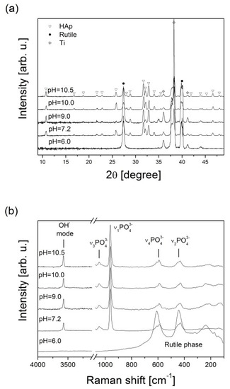 The XRD results were confirmed by Raman spectroscopy (Figure 3b). Samples synthesized at pH = 6.0 revealed Raman bands characteristic only for titanium oxide in rutile phase [34]. For other samples we observed the characteristic bands for HAp phase [35], i.e., vibrations of PO43− groups observed in the position of 390–470 cm−1 (ν2 mode assigned to the doubly degenerate bending vibration of O–P–O bonds), 560–625 cm−1 (ν4 frequency resulting from the triply degenerate bending mode of O–P–O bonds), 961 cm−1 (ν1 mode assigned to the symmetric stretching vibration of P–O bond), 1010–1100 cm−1 (ν3 mode attributed to the triply degenerate stretching vibration of P–O bonds), and OH− symmetric stretching mode in the high wavenumber region at 3575 cm−1.