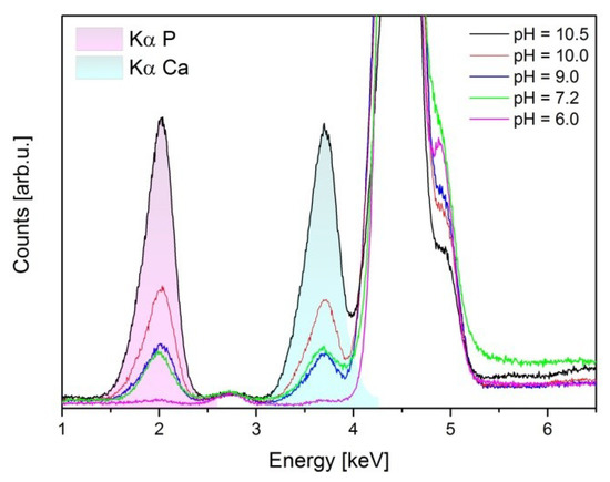 More details of the chemical composition of our samples were obtained by PIXE method. A unique opportunity offered by PIXE measurements is a non-destructive determination of the element concentration within a sample up to ppm level. PIXE offers high element sensitivities for transition elements with medium atomic mass and for that reason it is a very useful tool for monitoring changes in concentration of calcium phosphates [36]. Figure 4 shows the comparison of PIXE spectra obtained for the HAp coatings grown at different pH values. Peaks at energies 2.013 keV and 3.692 keV indicate Kα lines of phosphorous and calcium, respectively. In addition, the strong peaks observed between 4 and 5 keV energy, and week peak around 2.7 keV, testify to the presence of titanium. The results show the presence of both calcium and phosphorous species in all examined samples, even samples synthesized at pH = 6.0. The quantity of Ca and P for sample synthesized at lowest pH was relatively small and was significantly enhanced when the pH increased. The reduction of titanium contribution was also detected. PIXE spectra demonstrate that the content of calcium and phosphorus in the samples increases with pH, which indirectly indicates an increase in the amount of the hydroxyapatite phase. These data confirm prior observations, showing the increase of HAp thickness with the increasing ammonia concentration.