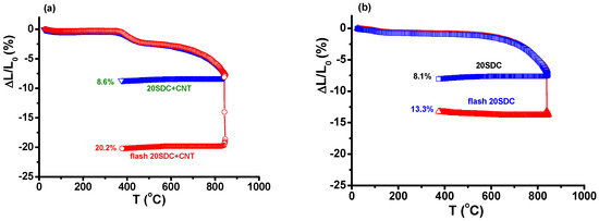 Figure 4 shows the dilatometric curves featuring the thickness shrinkage, from room temperature to 850 °C, of 20SDC + 10 vol% CNTs cylindrical pellets without and with the application of 210 V·cm−1 AC (1.1 kHz) electric field, limiting the current to 1 A to avoid thermal runaway that could occur with continuous increase of Joule heating. There is a 3% shrinkage of the sample with CNTs in the 400–450 °C range due to loss of CNTs, in agreement with the thermogravimetric data. The shrinkage levels attained were 8.6% and 20.2% without and with applying the electric field. Similar experiments were conducted in 20SDC samples without CNTs. The shrinkage levels were 8.1% and 13.3%, respectively, evidence of the enhancement of the densification by introducing CNTs in the 20SDC green pellets. Difference was also observed in the voltage–current temperature profiles, shown in the same figure. In the sample without CNTs, it takes 60 s for the flash event, i.e., for the electric current to reach the programmed value (1 A). The oscillation in the electric current might be due to the partial electronic conductivity of 20SDC, induced by the increase in temperature promoted by Joule heating. In the sample with CNTs, on the other hand, the applied voltage oscillates to yield a pulsed electric current through the sample. This might be due to the intermittent reaction of the CNTs with oxygen, yielding CO2 release.
