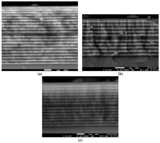 SEM micrograph of the Er3+ doped 1D dielectric microcavity cross section: (a) sample PC10, (b) sample PC05, and (c) sample PC07. The bright and dark regions correspond to TiO2 and SiO2 layers, respectively. The substrate is located at the bottom of the images and air at the top. All the structures are Er3+-doped with a concentration of 0.2 ± 0.1 mol%.
