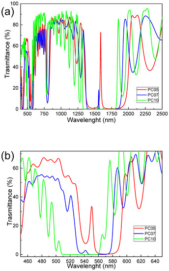 (a) Transmission spectrum of the samples PC10 (green line), PC05 (red line), and PC07 (blue line) in the region between 450 nm and 2500 nm. The first order stop band ranged from 1300 nm to 1850 nm. The first order cavity resonances correspond to the sharp maxima centered at 1559.2 nm (PC10), at 1566.8 nm (PC05), and at 1559.9 nm (PC07). The incident light was unpolarized. (b) Transmission spectra representing a third order stop band in the visible region between 500 nm to 560 nm with a third order cavity resonance at 536 nm.