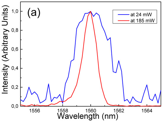 In Figure 3a, the photoluminescence spectra is reported for the 4I13/2→4I15/2 transition of the Er3+ ions obtained for the PC10 sample at excitation power at 514.5nm of 185 mW and 24 mW with the Ar+ laser. The erbium emission from the microcavity is centered at 1560 nm with FWHM of ≈1.2 ± 0.1 nm that corresponds to the resolution of the detection apparatus in the case of excitation power of 185 mW, while with the 24-mW excitation, the FWHM was equal to 2.4 ± 0.1 nm. The measurement was performed with a detection angle of 0 degrees and an excitation angle of 30 degrees. In Figure 3b, the photoluminescence intensity and the FWHM as a function of the pump power is plotted.