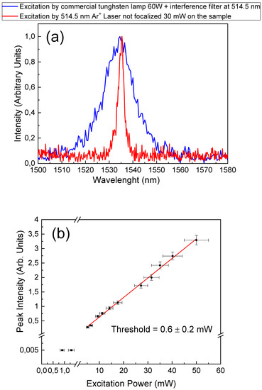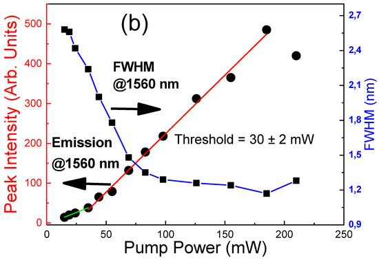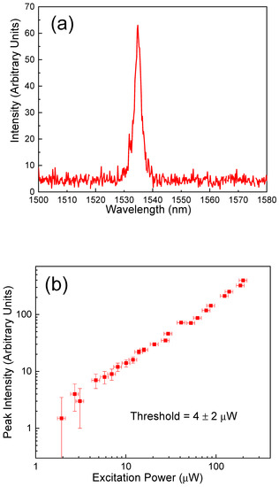 In Figure 5a, the photoluminescence spectrum is given for the 4I13/2→4I15/2 transition of the Er3+ ions obtained for the PC07 sample at an excitation power < 1 mW for the Xenon excitation lamp with a monochromator. The erbium emission from the microcavity was centered at 1535 nm with a FWHM of ≈ 2.1 ± 0.1 nm that corresponds to the resolution of the detection apparatus. The measurement was performed with a detection angle of 0 degrees and an excitation angle of 30 degrees. In Figure 5b, the photoluminescence intensity versus the pump power is given. The linear fit of the experimental data intercepts the x-axis at a pump power value of 4 ± 2 µW.