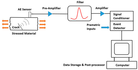 The Acoustic Emission (EA) method is a non-destructive technique (NDT) which provides useful information on changes and microstructural evolutions induced by different types of solicitations, e.g., mechanical, thermal, etc. It is a part of the implemented industrial Structural Health Monitoring (SHM) systems. A variety of damage mechanisms can be detected with this passive technique, such as phase transformation, realignment of magnetic domains, slip and movement of dislocation, intragranular and intergranular cracking, etc., and on numerous materials [14]. The principle of the AE technique is based on the phenomenon of a sudden energy release in the form of acoustic waves when material undergoes changes in its structure or microstructure. The signals recorded are in the range of 1 kHz to 1 MHz [15]. The main advantages of the AE technique are [16,17]: