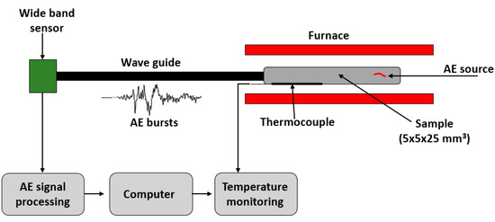 A broadband piezoelectric sensor µ80 (Mistras group SA, France) receives signals from the sample (3.5 × 3.5 × 25 mm3) via an alumina waveguide. The signals amplified were then processed using a MISTRAS 2001 (Mistras group SA, France) acquisition device and treated thanks to the NOESIS software.