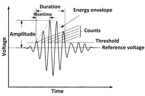The elastic waves emitted are initially volume ones that can be longitudinal (pressure) or transverse (shear) waves but are subjected to mode conversions according to the geometry of the sample. The combination of these different modes at a given time provides a transient vibration in the form of a set of signals. The characteristics of each wave (hit shape parameters; Figure 4), such as amplitude, duration, number of counts, the absolute energy and the time, make it possible to obtain the information necessary to identify and characterise the phenomena that occur in the material during testing.