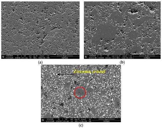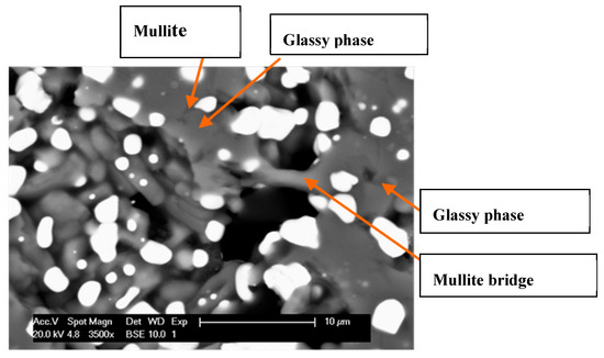 Samples M2 and M3 present some areas where the zirconia crystals are limited and very small compared to the other crystals distributed in the composite (red circle in Figure 5c). These zones consist of a crystalline network of mullite with conglomerates of small granular crystals of alumina. The presence of these alumina crystals shows an incomplete reaction with the vitreous phase derived from the reaction between the andalusite and the zircon to form secondary mullite. However, some authors [12,18,19] report that these small crystals of alumina tend to combine closely with mullite at high temperatures, giving the material a better mechanical performance. The presence of SiO2 (vitreous phase) was also identified in the microstructure of the mullite-zirconia composites, as shown in Figure 6. It is possible to observe the binding mechanism like a bridge between the crystals. This phenomenon can be very useful for enhancing the mechanical behaviour of these composites
