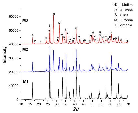 For M2 and M3 samples, one can see that the zirconia is mainly in its monoclinic phase. However, small amounts of quadratic phase zirconia can be observed, indicating that the martensitic transformation of zirconia was not complete. This effect may be due to the presence of impurities. The amount of amorphous phase present in the structure of the sample increases considerably in M3, which is attributable to the use of a greater proportion of zircon during its fabrication. We’ll see later that this fact plays an important role in the mechanical properties. Additionally, the results obtained from Archimedes’ density technique show that the open porosity change almost linearly with the zirconia content (Figure 8). A decrease in porosity is observed as the amount of zirconia in the samples increases.