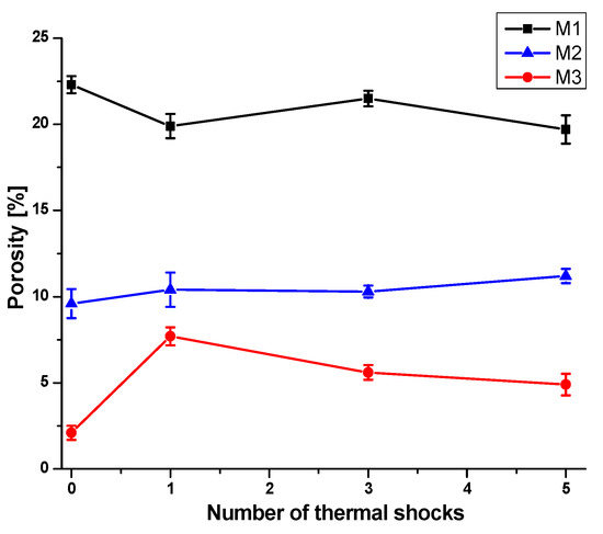Evolution of open porosity before and after successive thermal shocks for M1, M2 and M3 samples.