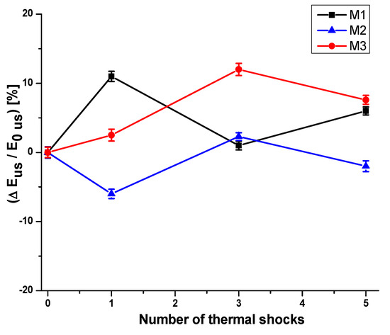 Another observation can be made. Although the M3 sample has the lowest porosity (Figure 8), E is smaller than M2. This decrease can be attributed to M3 having a greater proportion of amorphous phase (Table 2) in its structure, logically reducing the value of E. However, the Young’s moduli of M2 and M3 are superior to that of M1 one, even after having been submitted to three thermal shocks (Table 3, Figure 9). It is likely that this is associated with the repetition of the martensitic transformation Q-M (quadratic in monoclinic) which could occur during thermal shocks between temperatures of 750 °C and 500 °C [10,13]. As these samples have a considerable amount of zirconia in their structure, they can more easily block the propagation of the diffuse microcracks network and, therefore, improve their thermal shock performances.