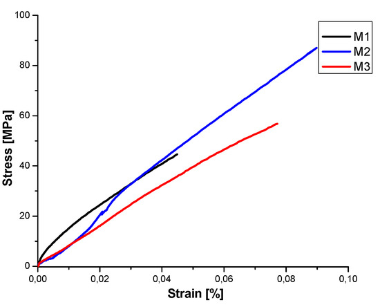 The observation of this figure clearly shows how the addition of zirconia modifies and improves the bending behaviour or M2 and M3 composites compared to M1 mullite sample. If one focuses on M1 bending curve evolution (Figure 11a), we can notice that after a limited non-linear domain (from 0 to 0.01% strain) (Figure 10), the behaviour is linear elastic like illustrating the fragile characteristic of this sample.