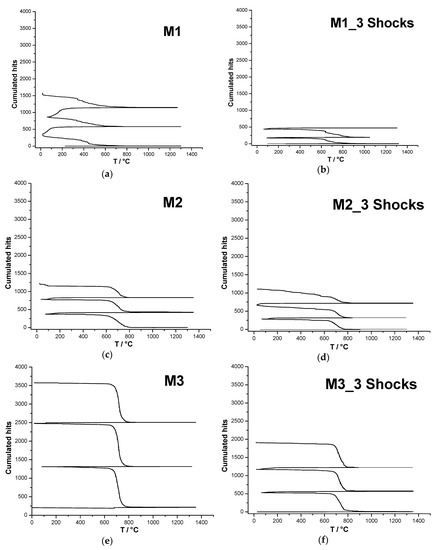 For M2 and M3 composite samples, either before and after thermal shocks (Figure 12c–f;), and contrary to the M1(mullite) sample, there is no significant AE during heating in any thermal cycle. However, an increase, both in the accumulated hits and in the hit rate, is observed, which is related to the amount of zirconia in the composite. In addition, it can be noticed that this sudden evolution of hit rate systematically occurs around 800 °C up to 600 °C (at lower temperature for the M1 (mullite) sample; 500 °C to 100 °C). Several hypotheses can be proposed to interpret these observations: