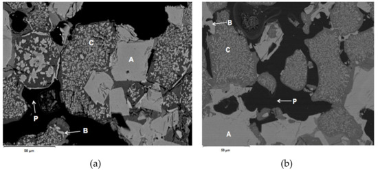 The microstructures of the samples are similar as they consist of three principal spinel types together with periclase (MgO) and minor amounts of forsterite (Mg2SiO4) and monticellite (CaMgSiO4). This is shown in Figure 1a,b. Spinel type A is prismatic in shape and retains this shape as the TiO2 content increases (primary spinel, Type 1 [8]). Spinel B is irregular in shape and appears to segregate to the periclase grain boundaries and grow irregularly in size as the TiO2 content increases (secondary spinel, Type 2 [8]). Spinel C (secondary spinel, Type 3 [8]), which exsolved from the periclase (grouped together with spinel B), also decreases in size as the TiO2 content increases. Minor amounts of forsterite and monticellite occur on the grain boundaries between spinel A and periclase.