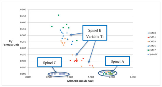 From the analyzed spinel compositions, it is apparent that two major spinel types are present in all of the CMD samples (apart from the fine-grained exsolved spinel present in sample CMD0). In Table 3 and Table 4, the spinel compositions labeled as spinel A represent the compositions of the coarse relict original chrome spinel. The spinels labeled as spinel B are the spinels that reacted with the magnesia and TiO2 to form new spinels with increased Ti contents. The fine-grained inclusions in the periclase show higher iron contents than those of the coarser spinel B inclusions and are labeled as spinel C. The compositions of spinels B and C (in sample CMD0) were grouped together to reconcile them with the XRD analyses (which show only two distinct spinels) and with the ICP analyses.