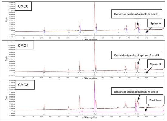 The Rietveld results of CMD0, CMD1, and CMD3 are shown in Figure 3 together with the peak allocations of spinel A, spinel B, and periclase. The correspondence between the calculated and experimental diffraction data is given in the difference curve (bottom curve). The small difference in the unit cells of spinels A and B in CMD1 is apparent in their almost coincident peaks at 75 degrees 2-theta.