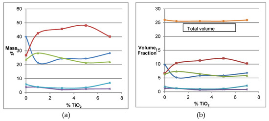 Because the volume percentages of the phases do not differ markedly from the mass percentages, and to illustrate the volume changes in the samples, the volume fractions were also calculated. These relate to the volumes per 100 g sample and were calculated by dividing the mass percentages of each phase by their respective densities. The latter were calculated directly from the average formulas and the refined lattice parameters, and will differ from sample to sample for each phase. This is shown in Table 6, and the respective mass percentages, volume fractions of the individual phases, and total volume changes are shown in Figure 4b.