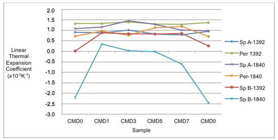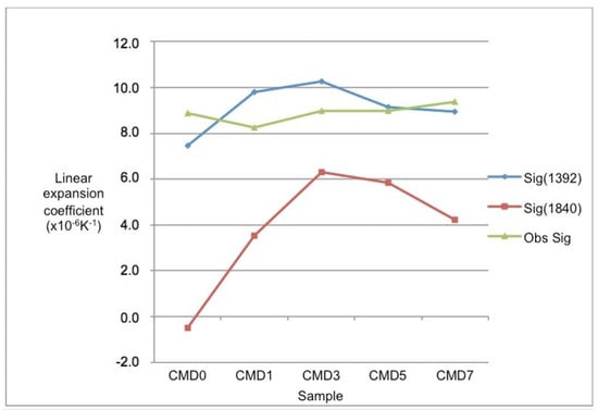 Individual and composite linear thermal expansion coefficients derived for samples CMD0 to CMD7. All values in K−1.