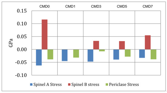 The calculation of the linear thermal expansion coefficients, especially at high temperatures, shows a trend towards negative expansion coefficients or a flattening of the expansion of spinel B, which is accentuated by the increase in its content in all samples except sample CMD0. This decrease in expansion coefficients is most likely due to compression of the spinel inclusions by the host periclase. The difference in the expansion coefficients is the smallest in sample CMD1, and the stress due to this difference is also the smallest in this sample. This is graphically shown in Figure 7 for the temperature interval 1392–1840 K.