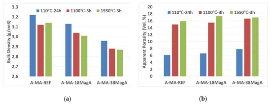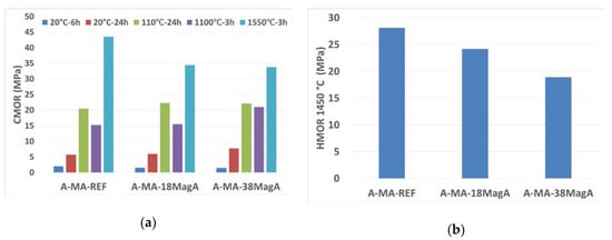 Despite the slightly higher porosity and lower density, the CMOR (cold modulus of rupture) was not negatively affected (Figure 3a). The strength after 24 h of curing at 20 °C, after drying at 110 °C and firing at 1100 °C, was even slightly increased. The small increase was probably due to the presence of calcium mono-aluminate (CA) in MagA that might partly have dissolved together with the calcium aluminate binder in the mixing water and then contributed to the hydraulic bond. After firing at 1550 °C, the CMOR was reduced. This was in line with the HMOR (hot modulus of rupture) measured at 1450 °C, which also reduced with the addition of MagA (Figure 3b).