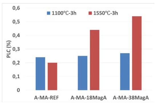 Permanent linear change (PLC) after firing at 1100 °C and 1550 °C.