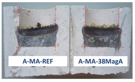 Static corrosion trials were performed at 1600 °C for 3 h with cups made from A-MA-REF and A-MA-38MagA castables. They were filled with a Fe2O3-rich and F-containing ladle slag with a C/S ratio of 6.7. The chemical composition is shown in Table 4. Macroscopically, no significant differences could be observed between the two castables (Figure 5). This was remarkable taking into account the significant difference in aggregate porosity and castable density. This was also different from findings with porous alumina aggregates where a stronger penetration was observed [9], but confirmed the studies of Fu et al. [10], who reported an improved performance when using a microporous corundum, and of Chen et al. [6], who found that a porous MA spinel aggregate performed similarly to a dense alumina aggregate.