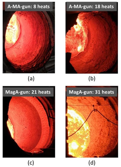 Steel ladles repaired with an A-MA-gun after eight heats in operation (a) and 18 heats (b) versus MagA-gun after 21 (c) and 31 heats (d).