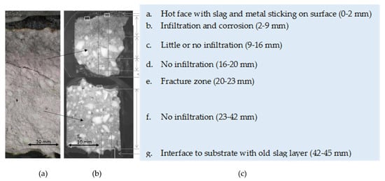 As can be seen in Figure 7, the gunning material had some slag sticking on the hot surface (zone a), showing a slightly darker, probably penetrated zone of approximately 9 mm (zone b), followed by a zone (c–f) with little or no infiltration (9 to 42 mm). Inside that zone, a crack occurred, and it opened up when samples were prepared for microscopy (Fracture Zone e). The backside of the sample, which faced the substrate material, had a thin black layer sticking on it with a thickness of up to 3 mm (Zone g). This thin layer most likely originated from the slag that was still sticking on the substrate castable when the gunning mix was installed in the ladle wall.