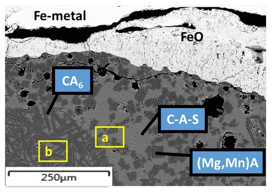 A thin metal film stuck to the surface of the sample, separated by a little gap from a layer of iron oxide, mainly FeO and some Fe2O3 (Figure 8). Iron oxide did not migrate deeply into the refractory material and remained largely concentrated close to the refractory surface, while manganese was mainly captured by spinel in the first few millimeters of the refractory. That iron oxide layer was up to 250 µm thick and closely connected to the underlying refractory material. In direct contact to the iron oxide, mainly calcium aluminum silicate with a composition close to gehlenite (C2AS) and manganese-enriched MA spinel grains occurred. A zoom into this zone (a) with the positions of EDX spot analyses is presented in Figure 9a. The analysis indicated that between the gehlenitic areas and the spinel crystals, a probably glassy phase was trapped with a chemical composition including mainly calcium, aluminum, and silicon, but also some manganese, titanium, and fluorine, probably from slag fluxing (Table 5). Furthermore, some areas with an enrichment of hibonite needles (CA6) were observed (Figure 8), and a zoom into this area (b) is shown in Figure 9b. The EDX analyses also showed here that between the CA6 needles, mainly phases close to C2AS composition, spinel, and some other glassy phase were trapped (Table 5). The elemental distribution revealed that iron did not diffuse deeply into the refractory material, while manganese was clearly present up to 400 µm into the repair material, but did not enter the CA6-enriched area. Although the EDX analyses indicated phases close to C2AS, the XRD analysis of this front zone did not signal any crystalline C2AS. Probably glassy calcium aluminum silicate phases with variable compositions were dominating this front zone. The whole front zone showed very little porosity, which obviously prevented slag from deep penetration into the material. As seen with the static corrosion test, despite the presence of the porous MagA grain, no excessive slag penetration was observed. In the case of MagA-containing refractories, the penetration and corrosion front was homogeneous without any preferential penetration through the pores of the MagA grains.