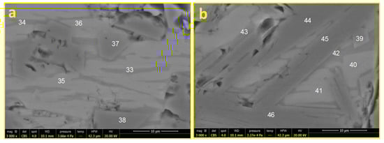 Zoom into Areas a (a) and b (b) of Figure 8 with the positions of EDX-spot analyses.