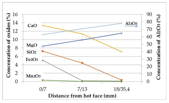 To quantify the chemical alteration on the hot side versus the non-penetrated refractory material, samples were taken for XRF measurements from the front side (0–7 mm), from the range 7–13 mm, and 18–35 mm behind the hot face. An increased level of CaO, SiO2, Fe2O3, and Mn2O3 at the hot face was confirmed here too (Figure 10), and both Al2O3 and MgO were relatively lower than in the original gunning mix. While an increased level of silica and lime was still observed 7–13 mm behind the hot face, both iron oxide and manganese oxide were here almost as low as in the original gunning mix. This low iron- and almost manganese-free silica lime slag penetrated and densified the gunning mix up to approximately 9 mm, as observed with SEM-EDX.