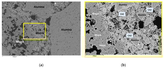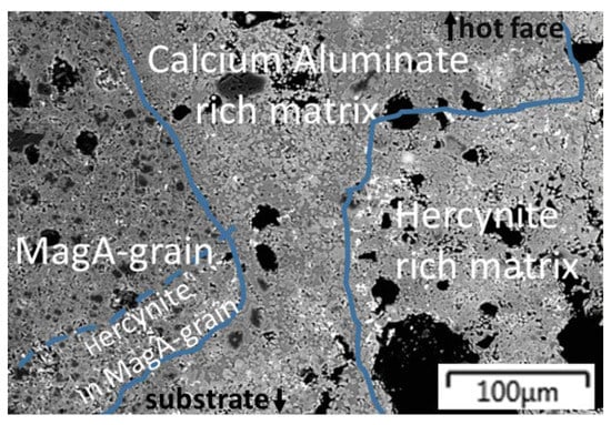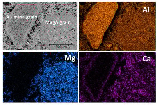 A sample that was taken about 33 mm behind the hot face clearly showed that no penetration had occurred here. Alumina and MagA grains were embedded in a fine-grained matrix (Figure 11a). Neither the pores of the MagA grains, nor the pores in the matrix showed any sign of slag infiltration. EDX analyses (elemental distribution and point analyses) confirmed that the alumina grains reacted with lime from the surrounding calcium aluminate binder or MagA to form a rim consisting of CA2 (Figure 11b). This might explain why in some cases, the alumina grains seemed to be less well connected to the matrix with some pores at the grain boundaries. This was in contrast to the MagA grains that were well connected with the matrix.