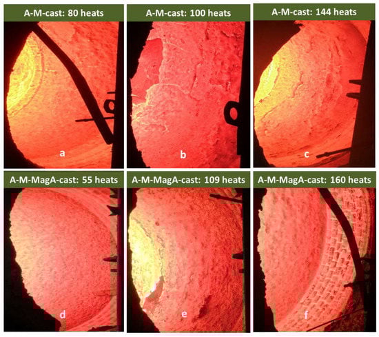 Figure 14a–c shows the ladle wall with A-M-cast after 80, 100, and 144 heats in comparison to A-M-MagA-cast after 55, 109, and 160 heats (Figure 14d–f). The A-M-cast showed significant cracks after 80 heats that further opened during the following heats, as can be seen in Figure 14b, and with layers starting to spall off the wall. After 144 heats, the cracks and spalling became the life-limiting factor, and the ladle had to be taken out of operation without using the full potential of the MgO-C slag line. Contrary to this, the A-M-MagA-cast was significantly less damaged and was still in quite good condition after 160 heats, so that the lifetime of one wall lining was well balanced with the lifetime of three slag zones made of MgO-C.