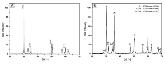 X-ray diffractometry (XRD) analyses of these samples were carried out in a D8 diffractometer (Bruker AXS Inc., Madison, WI, USA) using CuKα radiation (λ = 1.5405981 Å) working at 40 kV and 30 mA in a step-scanning mode with a step size of 0.01° and a scan speed of 0.06°/min at diffraction angles 2θ ranging from 20° to 70°. Analyses of the crystal phases were found using the following ICSD codes: 62,994 (t-ZrO2), 41,572 (m-ZrO2) and 43,700 (zirconium).
