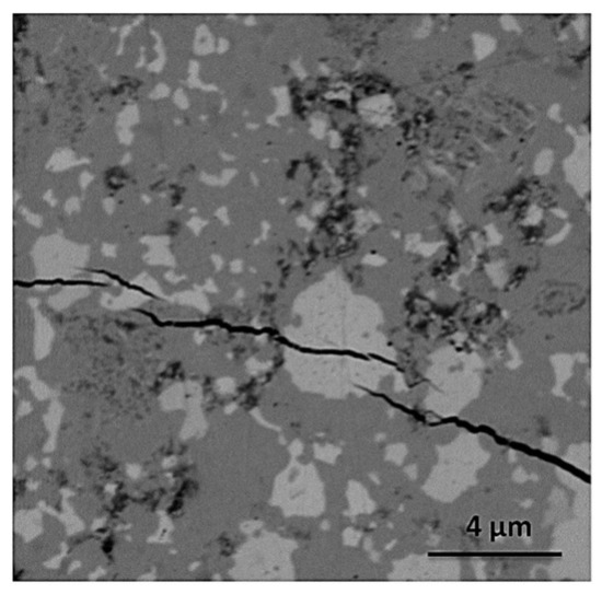 An electron micrograph of the ZrO2-Zr composite is shown in Figure 2A. In this micrograph, the darker and bright phases are zirconia and zirconium grains, respectively. A duplex grain size distribution of zirconium particles is observed. Wet processing of zirconia and zirconium powders using pentanol as the liquid medium allows obtaining compacts wherein the zirconium particles are uniformly dispersed in the matrix, without the presence of large agglomerates of metal or ceramic particles. It is known concerning the capability of alcohols to electrostatically stabilize suspensions containing small ceramic particles by the formation of an electrical double layer with a net negative charge on the particle surface [36,37,38,39]. The mechanisms proposed to explain the electrical double layer formation in organic liquid media are based upon donor–acceptor interactions between particle surface and organic liquid [36]. In the case of amphoteric oxides, like titania or zirconia, which have a point of zero charge (PZC) ≈6 [40,41], the mechanism proposed by Damodaran and Mougdil [42] to explain the surface charge of oxide particles and electrical double layer formation in alcoholic media can be summarized in the following steps: (1) The adsorption of two alcohol molecules on the oxide particle surface; (2) the ionization and formation of RO− and ROH2+; (3) capture of H+ from the oxide surface by RO−; (4) and the desorption of ROH and ROH2+. Zeta potential measurements show that the values become less negative as the molecular size of the alcohol increases, due to their dielectric constant decreasing, and therefore, their tendency to ionization on the surface also diminishes. On the other hand, the adsorption of generated ROH2+ increases for alcohols with larger molecular size, which partially neutralizes the surface negative charge [39]. Thus, alcohol having smaller molecular size, like methanol, should form more easily the electrical double layer and yield more stable suspensions. However, Farrokhi-rad et al. [39] found out the opposite behavior for the series methanol, ethanol, isopropanol and butanol, the methanolic suspension being the less stable. In order to explain this result, Farrokhi-rad et al. took into account the effect of the viscosity of different alcohols on the diffusion coefficient given by the Stokes–Einstein equation [43], which is directly related with the tendency of particles to form agglomerates: