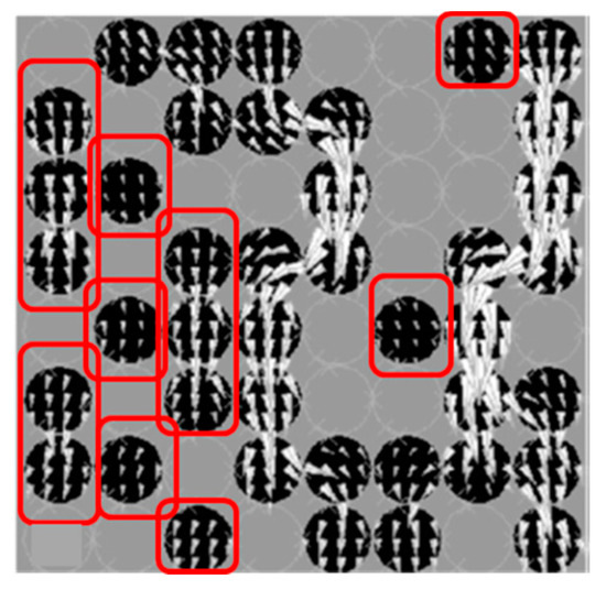 The porosity acts as a brake in the displacement of the walls, as well as in the generation of internal demagnetizing effects. An example of internal demagnetizing effect is given in Figure 4, showing that the presence of a non-magnetic phase in a heterogeneous magnetic material leads to discontinuities of the magnetizing flux lines (areas framed in red), generating demagnetizing effects. Consequently, it significantly influences the magnetization processes by displacement of walls, and therefore permeability. Porosity is an adjustment parameter for permeability, which is therefore important to control as well as possible.