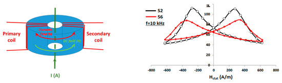 At first, the real part of the permeability of the toroidal samples was measured at f = 10 kHz, by the transformer method (Figure 6), using a hysteresis meter with lock-in amplifier. The maximum change in permeability obtained when the DC field is varied between zero and its maximum value is called the permeability dynamic Δµ. Orthoradial symmetry common to the polarization field H (generated by a control current I) and to the microwave field h respects the symmetry of the sample, thus avoiding the creation of demagnetizing effects other than those related to grain boundaries and porosity. The measurement results (Figure 6) show for samples S2 and S6 a dynamic Δµ close to 70 and 30, respectively, for a static field varying between 0 A/m and 526 A/m (mean value calculated over the volume of the sample), i.e., 6.6 Oe, corresponding to a maximum current of 9 A. However, these first results do not give any information on the imaginary µ″ part of the permeability and have to be confirmed in the working frequency band of the antenna.