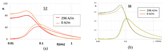 Permeability variations of (a) S2 sample and (b) S6 sample as a function of the frequency of the HF field, for two intensities of the DC field (insert: the values of the averaged DC field over the sample, limited here to 3.7 Oe, i.e., 296 A/m.) Real and imaginary parts are full and dashed lines, respectively.